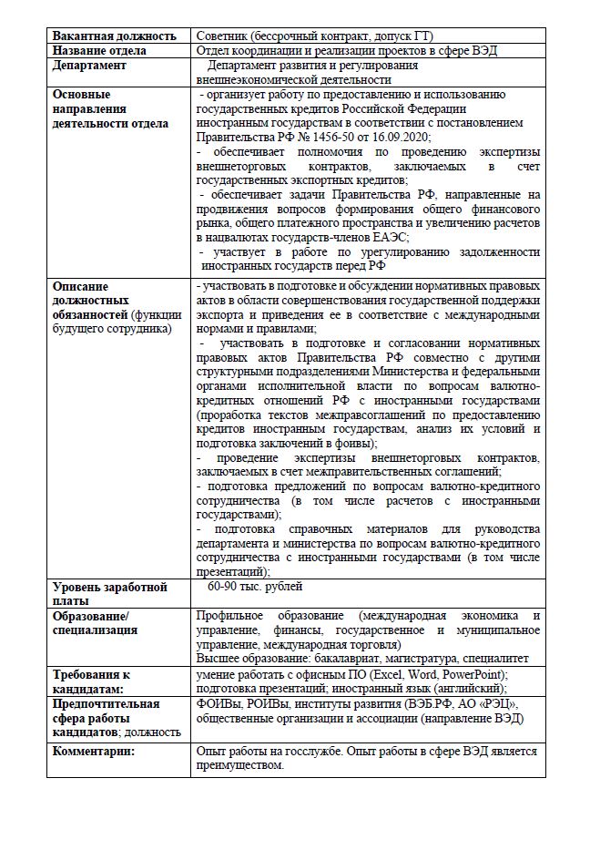 Федеральное министерство ищет выпускника на должность советника. Резюме направлять на электронную почту Центра карьеры ВАВТ: career@vavt.ru.