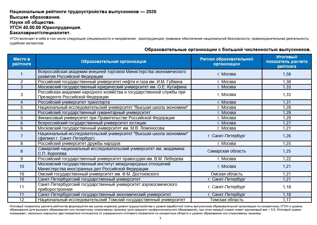 Академия заняла первое место по направлению «Юриспруденция» среди 85 образовательных учреждений и второе место по направлению «Экономика и управление», опередив более 150 вузов, в Национальных рейтингах трудоустройства выпускников — 2026, опубликованных Министерством труда и социальной защиты РФ.